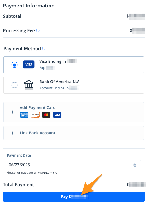 5. Select a payment method and click the blue Pay $--.-- button to complete your payment